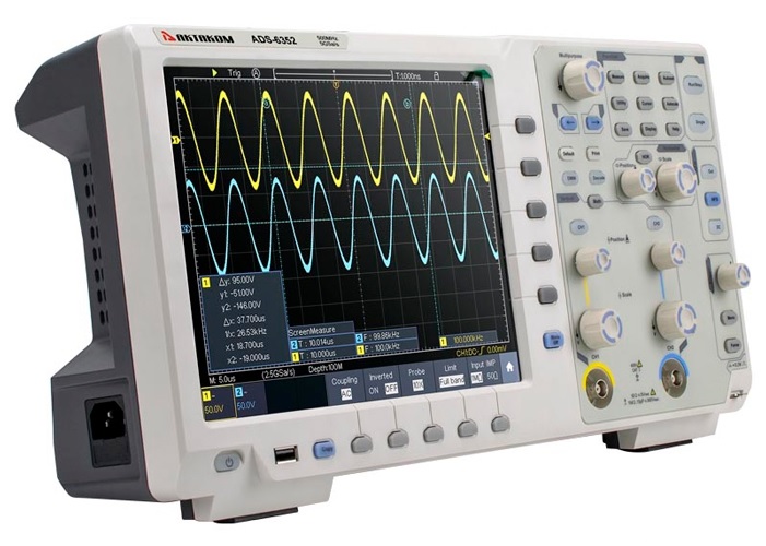 Двухканальный многофункциональный осциллограф ADS-6352 выпускается с полосой пропускания 500 МГц. Аналогично другим осциллографам Актаком серии ADS-6000 в ADS-6352 установлен сенсорный мультитач дисплей с размером 10,4", который позволяет проводить управление прибором и измерения при помощи касаний и жестов. Уже в стандартной поставке в одном корпусе объединены до 7 измерительных приборов.