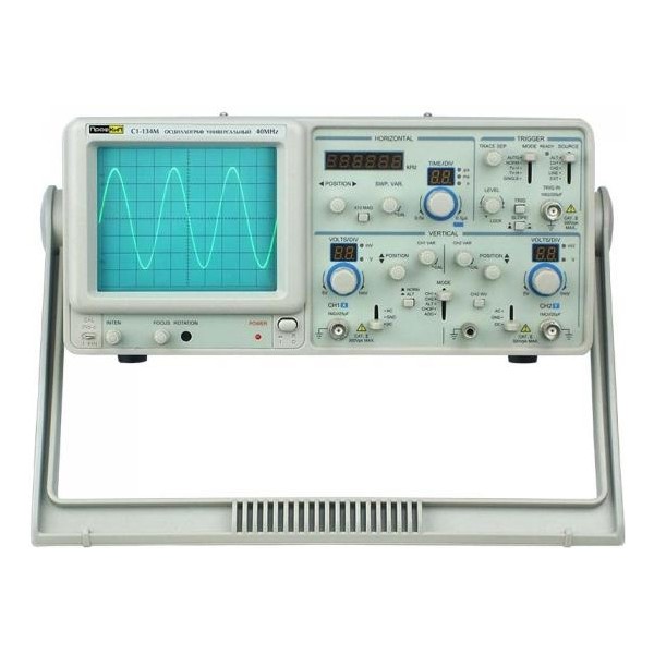 Осциллограф универсальный ПрофКиП С1-134М предназначен для исследования электрических сигналов путем визуального наблюдения их формы и измерения амплитудно-временных параметров сигнала по калиброванной шкале ЭЛТ. Осциллограф универсальный ПрофКиП С1-134М применяются при регулировке, ремонте и обслуживании РЭА в лабораторных, цеховых и полевых условиях эксплуатации. Может быть использован для контроля электрических параметров в промышленных и научных исследовательских лабораториях, ремонтных мастерских, учебных заведениях, в радиолюбительской практике.