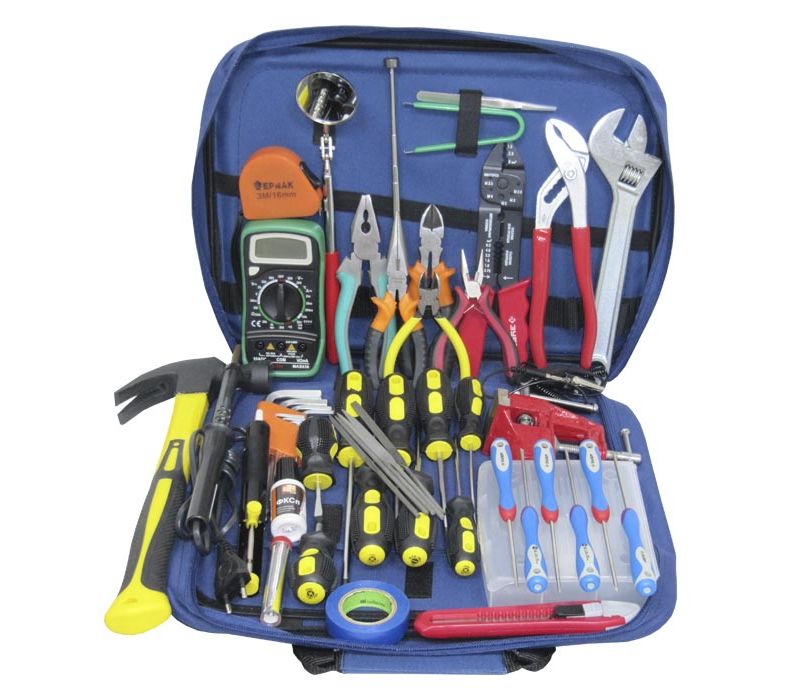 В состав набора комплектуются: отвертки, плоскогубцы, кусачки, клещи, молоток, тиски, торцевые головки, паяльник, нож, рулетка, пылеудалитель, ножницы, изолента, пинцет. Набор поставляется в удобной инструментальной сумке с ручками и плечевым ремнем.