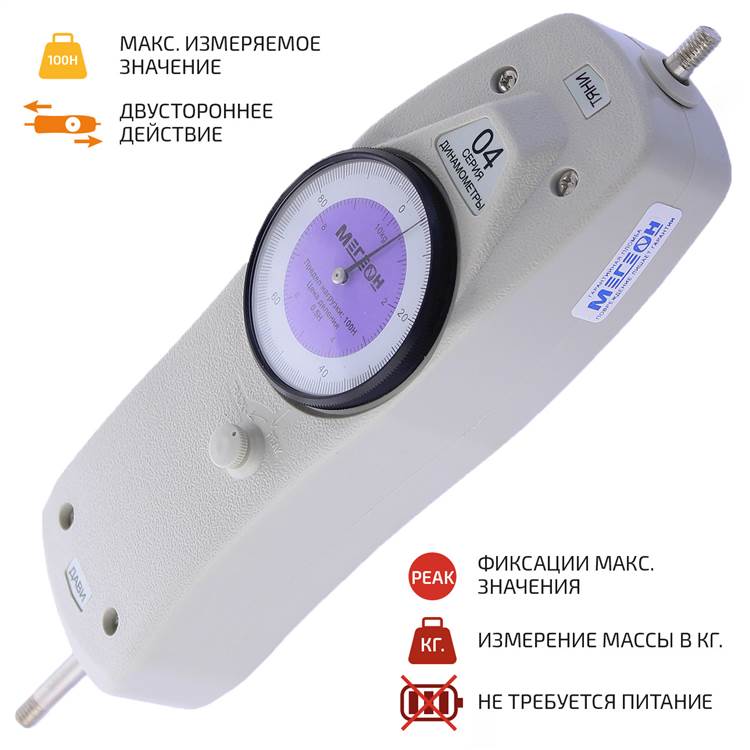 Портативный динамометр МЕГЕОН 04100 представляет собой аналоговое измерительное устройство, отличающееся высокой надежностью и точностью. Динамометр состоит из упругого элемента, соединенного с отсчетным механизмом. При воздействии нагрузки упругий элемент деформируется. В результате прикладываемое усилие передается на стрелку. По расположению стрелки на шкале определяются показания динамометра. Динамометр МЕГЕОН 04100 является механическим динамометром. Приборы данного типа нашли широкое применение во многих отраслях производства и даже в быту.