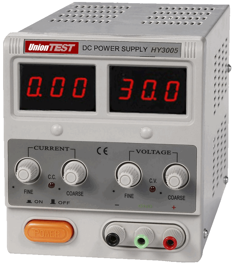 UnionTest HY3005 (прежнее название Mastech HY3005) – источник питания, позволяющий получать регулируемое, точное и стабильное постоянное напряжение или постоянный ток. Две пары регуляторов грубой и точной настройки облегчают установку напряжения и тока, а цифровые светодиодные индикаторы тока и напряжения упрощают считывание параметров выхода.