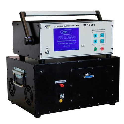 Установка высоковольтная ВУ 10-250 создана для генерирования напряжения переменного тока синусоидальной формы частотой 50 Гц, напряжения постоянного тока, а также измерения напряжения и силы переменного и постоянного токов при проведении испытаний и диагностировании объектов и материалов, для испытаний которых требуется высокое напряжение.