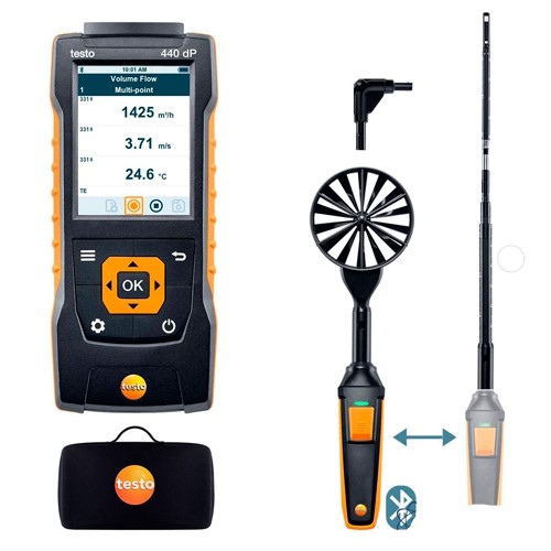 Особенности комплекта для вентиляции №3 с Bluetooth крыльчаткой 100 мм 0635 9431, зондом с обогреваемой струной 0635 1570, телескопической рукояткой 0554 0960 и кейсом 0516 4401 testo 440dp (0563 4409):